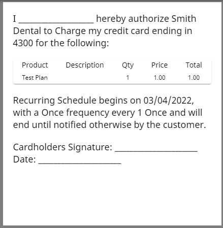 The auth form is a form that spells out all of the information above, and allows both the office, and the card holder to be on the same page as to when the recurring charges will begin and end. It also allows for a place for the customer to sign for the practice records.