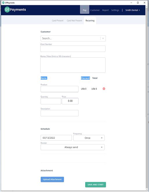 For recurring payments enter the Pay module, then recurring tab. You will be prompted for the following information: