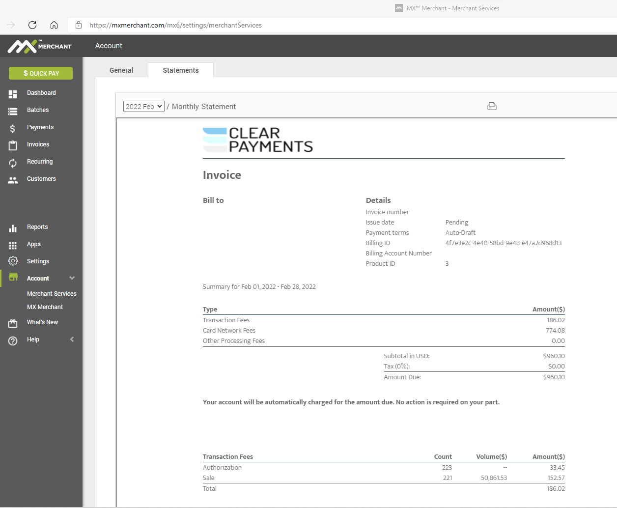 Once you log into DTPayments MxMerchant Portal, click on the Account menu on the left, then "Merchant Services". From there, you will want to click the Statements tab. You will have an option to select which month statement you wish to have. You can download a PDF, or print the statement for your records.